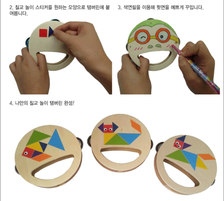 칠교놀이 스티커를 이용해 도형감각을 키우고 창의력을 발휘하여 탬버린에 스티커를 붙여 보는 나만의 칠교놀이 탬버린 만들기 체험교실.